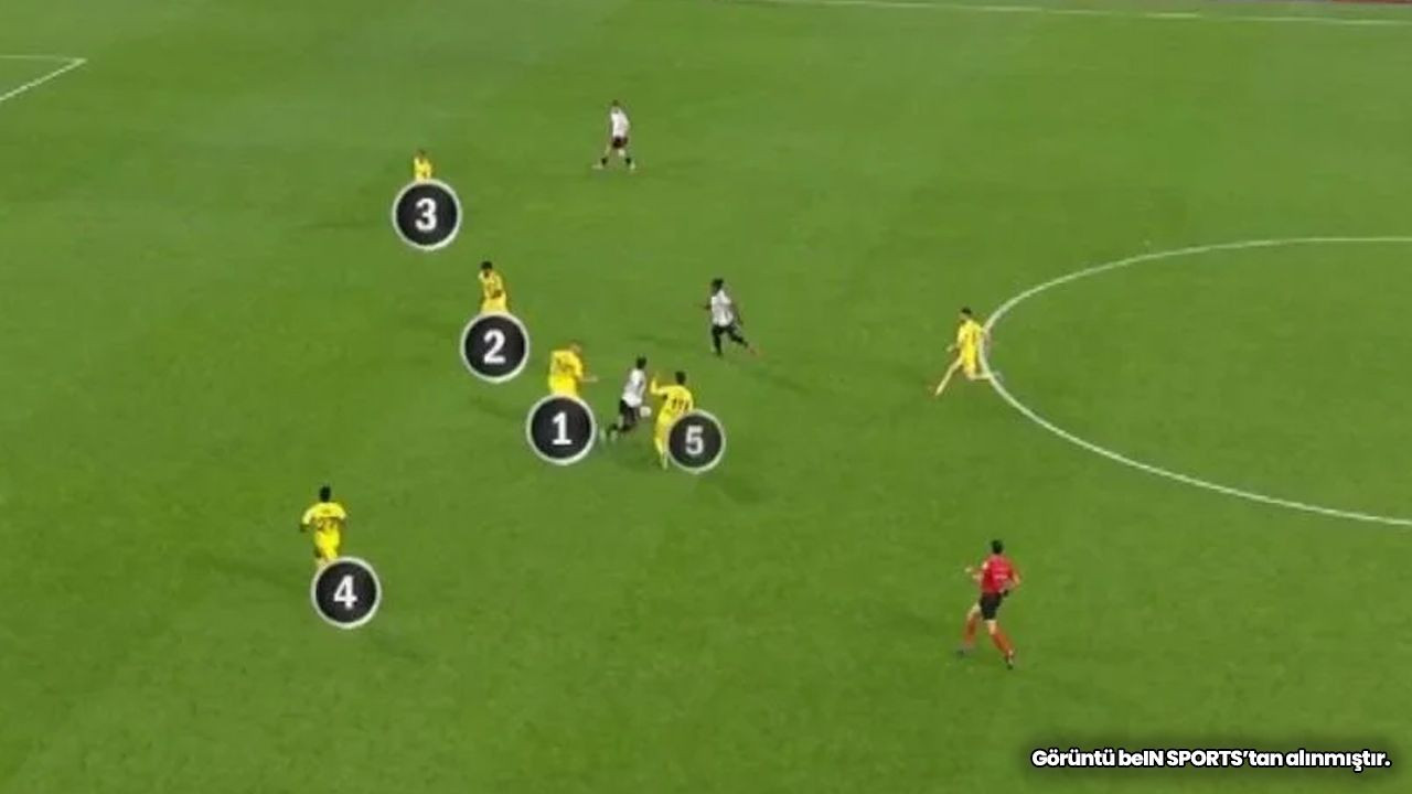Bülent Yıldırım: Bu faulde umut vaad eden durum var mı, taktik faul mü, kontra mı yakalandı, hayır. Defans yerinde. Kontrolsüz faul olursa sarı kart olur. O var mı? O da yok. Basit bir diz teması, orta alan faulü. Bu sürtme sadece faul. Sarı kart yanlış.