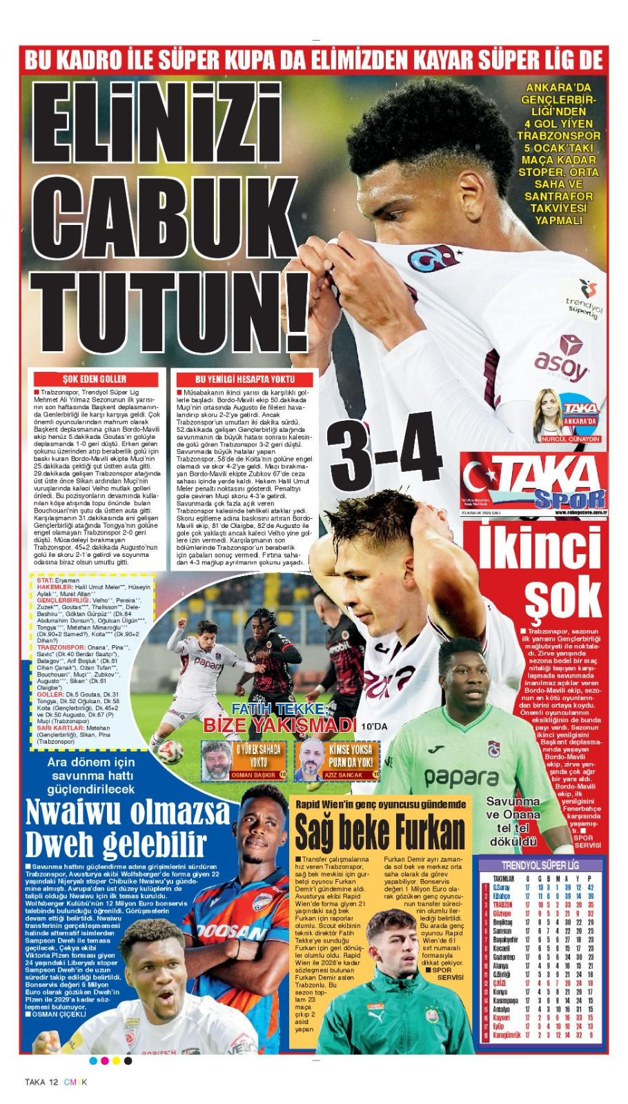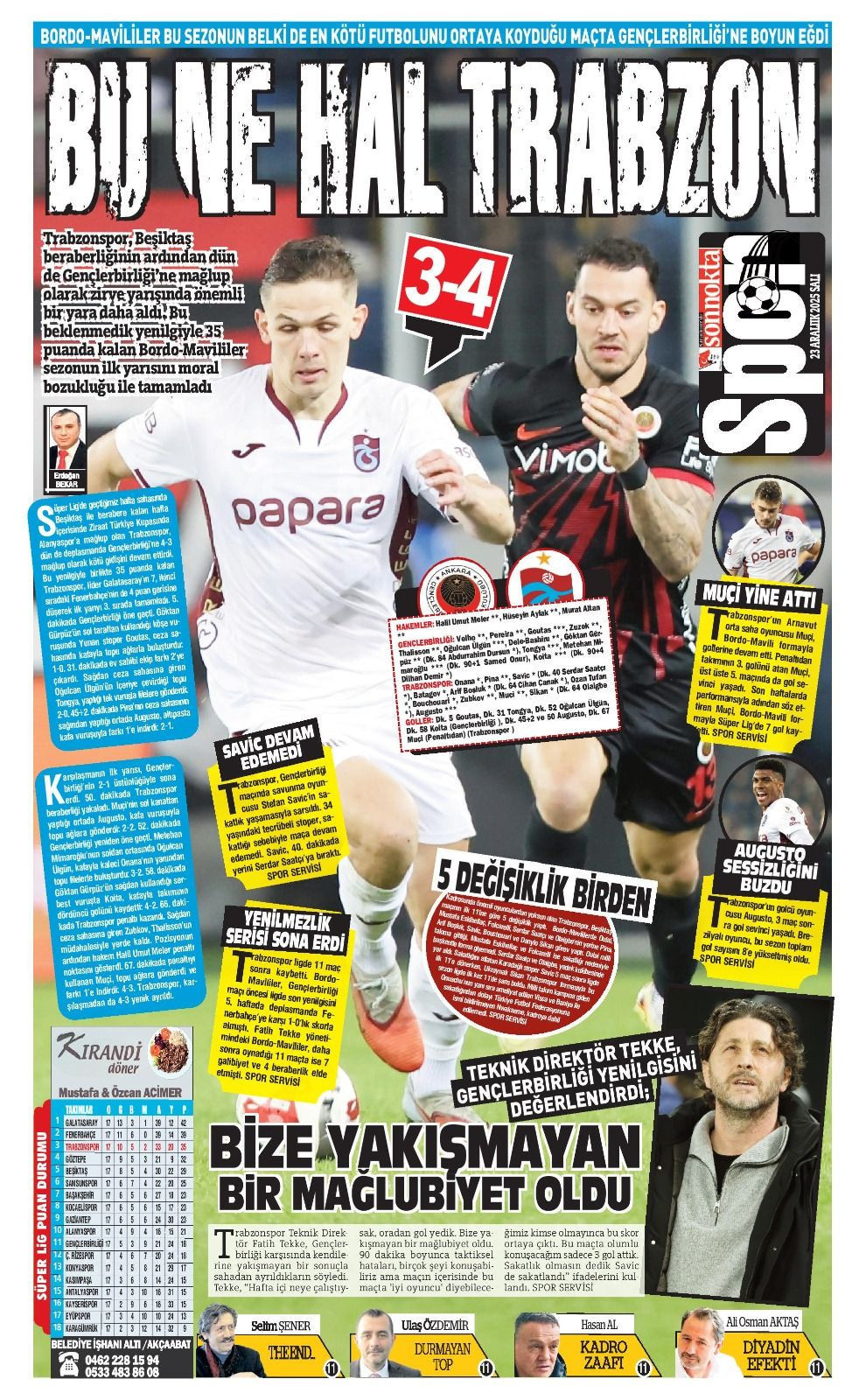 Trendyol Süper Lig'in 17. haftasında Trabzonspor deplasmanda Gençlerbirliği'ne 4-3 mağlup oldu. Trabzon yerel basını, bordo-mavililerin performansını eleştirdi.